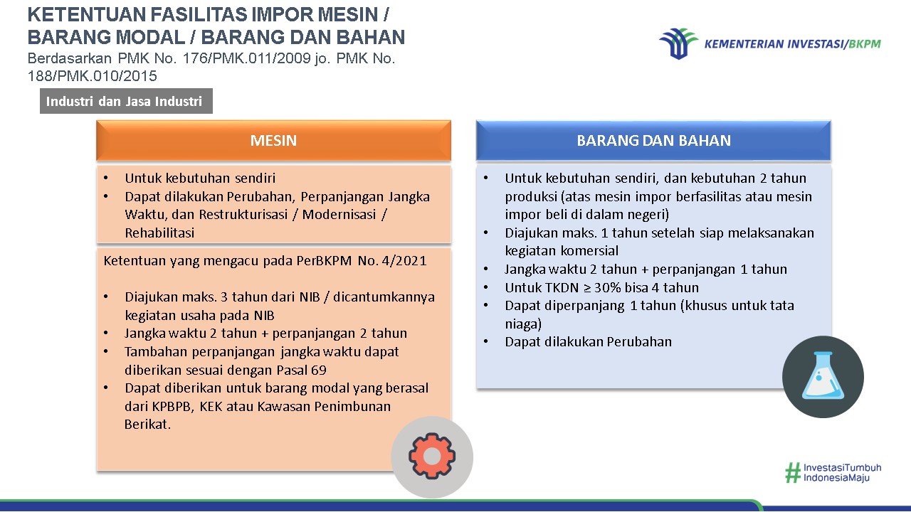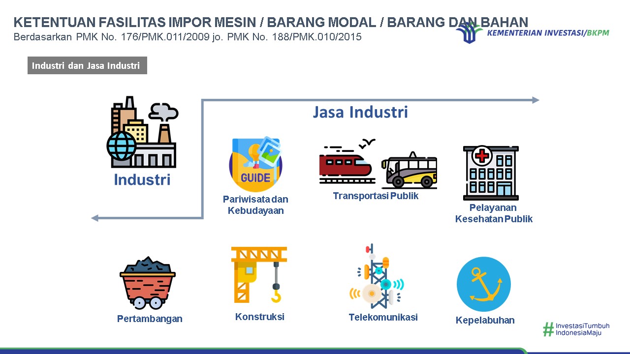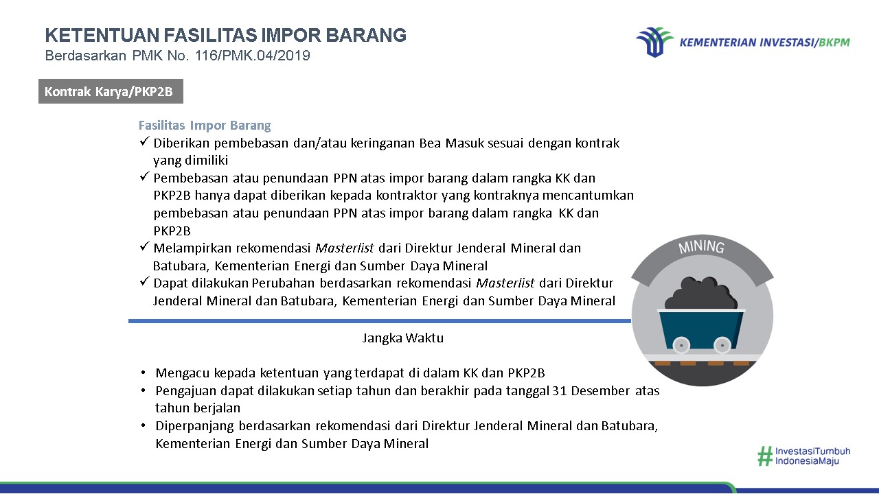 Fasilitas pembebasan bea masuk impor dapat diberikan kepada Pelaku Usaha yang melakukan kegiatan usaha di bidang industri yang menghasilkan barang dan/atau jasa (Peraturan Menteri Keuangan Nomor 176/PMK.011/2009 jo. Nomor 188/PMK.010/2015), industri pembangkitan listrik (Peraturan Menteri Keuangan Nomor 66/PMK.010/2015), serta Kontrak Karya/PKP2B (Peraturan Menteri Keuangan Nomor 116/PMK.04/2019).